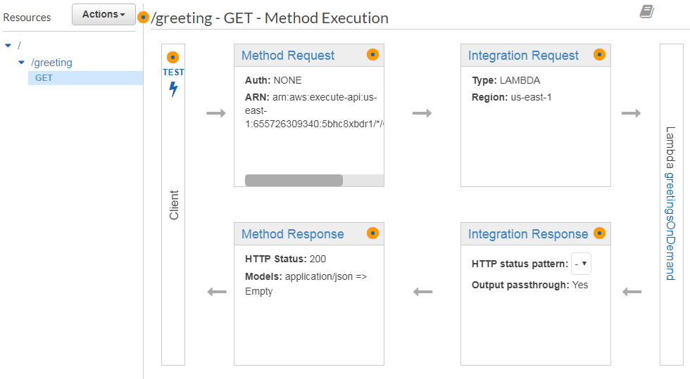 4. The back-end implementation, in this case using AWS Lambda with the greetingsOnDemand